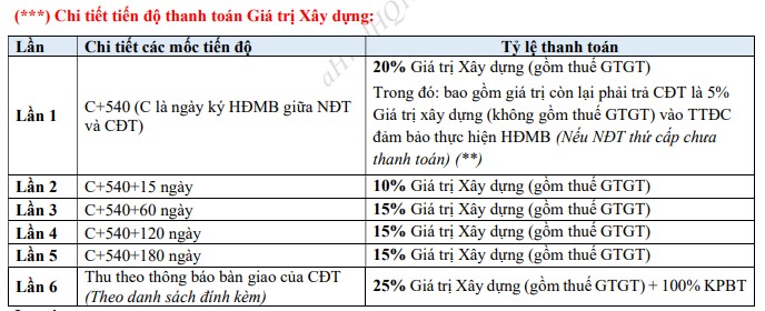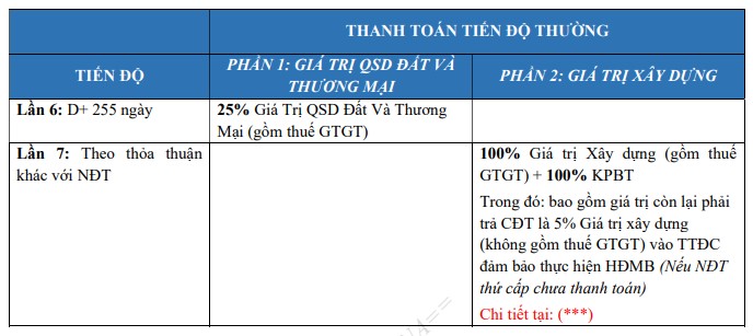 - Lần 3: 100% Giá trị xây dựng + 100% KPBT theo thỏa thuận với NĐT