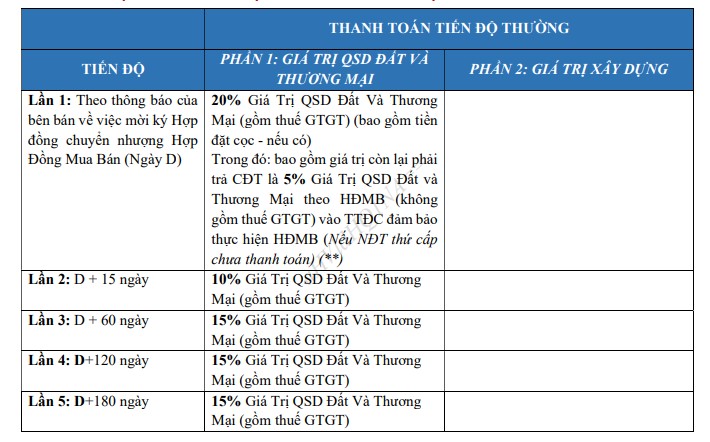 - Lần 1 (Ngày D): 20% (bao gồm đặt cọc và 5% TTĐC nếu NĐT chưa thanh toán)
