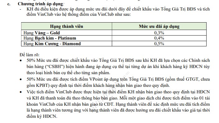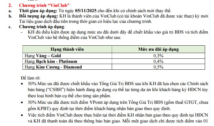 Khách hàng cần có tài khoản VinClub đã được xác thực tại thời điểm ký Tài liệu giao dịch đầu tiên. 50% được chiết khấu ngay vào giá, 50% được tích điểm VPoint khi nhận bàn giao và đã thanh toán đủ.