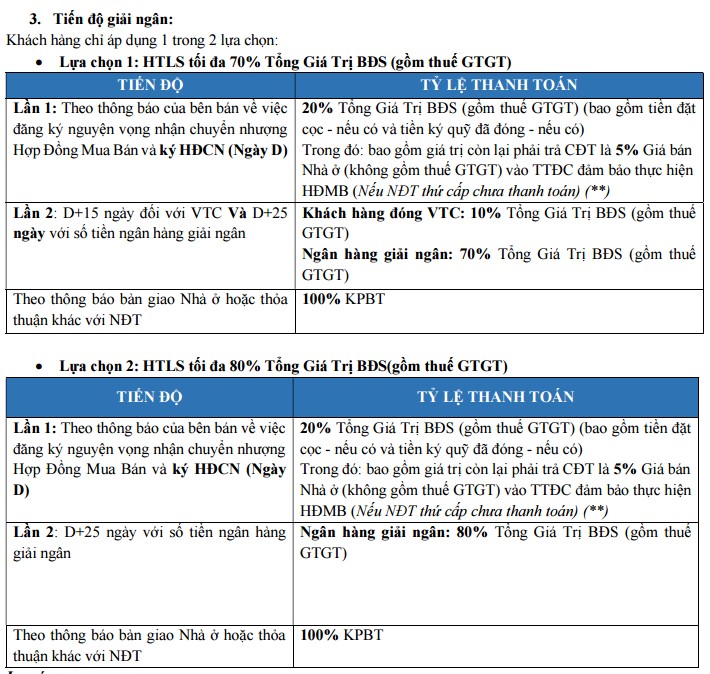 - Lần 2 (D+15 ngày): KH đóng 10%, Ngân hàng giải ngân 70% vào D+25 ngày