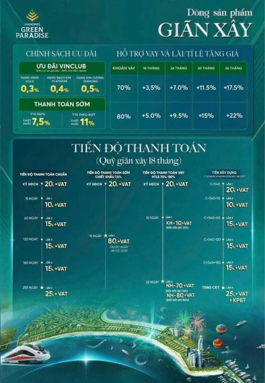 Quỹ căn thô giãn xây 18 tháng của Vinhomes Green Paradise là lựa chọn dành cho nhà đầu tư muốn tham gia sớm với cam kết tiến độ xây dựng và bàn giao được kéo dài, tạo điều kiện thanh toán linh hoạt hơn.