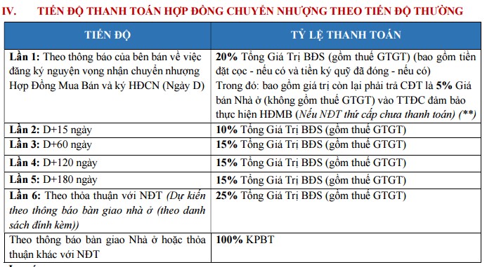 - Lần 1 (C+540 ngày): 20% (bao gồm 5% TTĐC nếu NĐT chưa thanh toán)