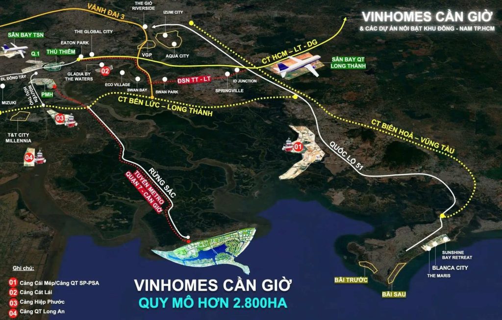 Thông qua nút giao cao tốc Bến Lức – Long Thành (hoàn thành Quý 1/2028), vị trí Vinhomes Cần Giờ kết nối thuận lợi với: